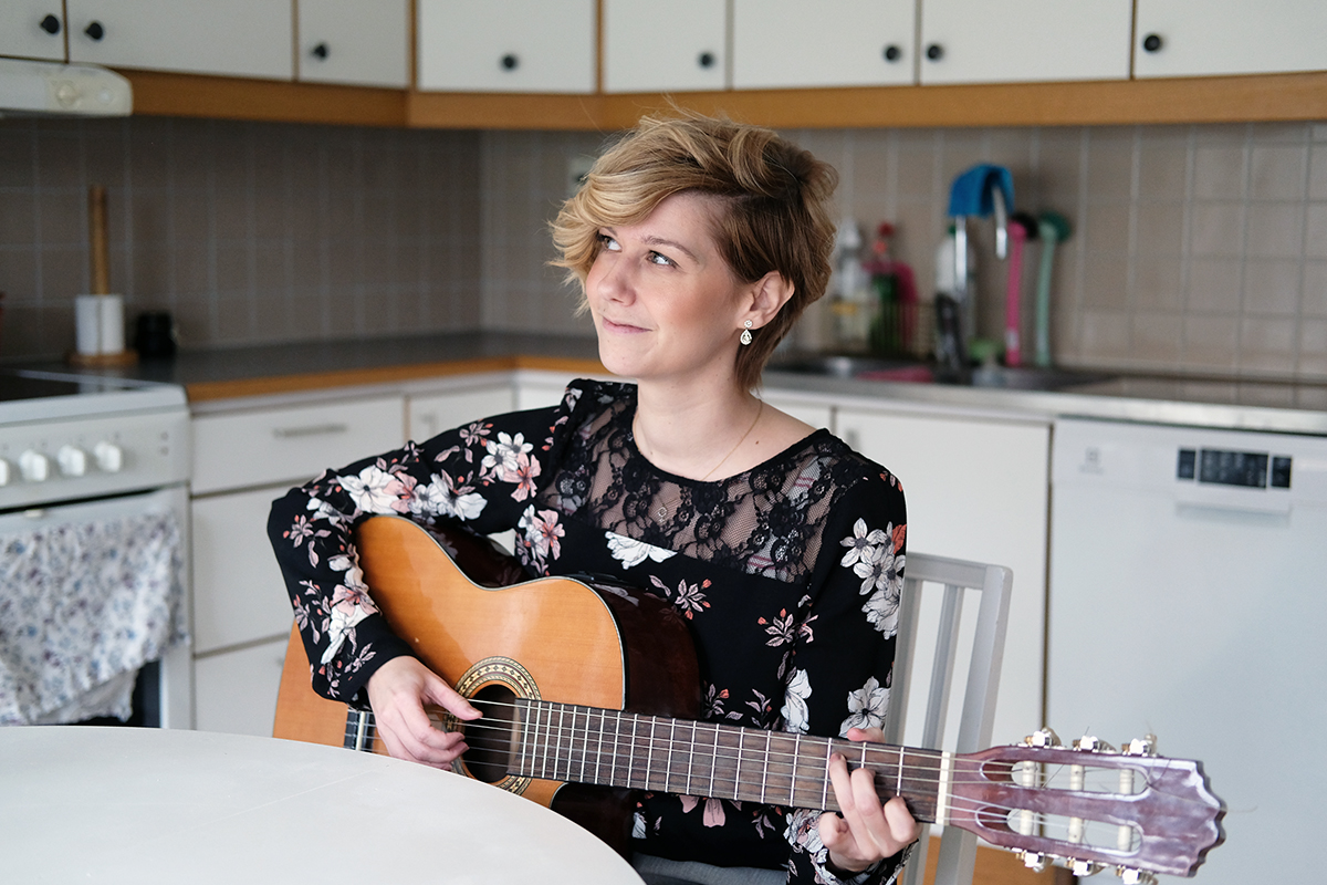 Hon skriver fortfarande hemma vid köksbordet men under något stökigare former än tidigare. Så här går det till: först lägger hon dottern i barnvagnen, sen sätter hon på dammsugaren och smyger bort till köksbordet, tar upp gitarren och spelar så tyst hon kan, ofta i 20 minuters pass.