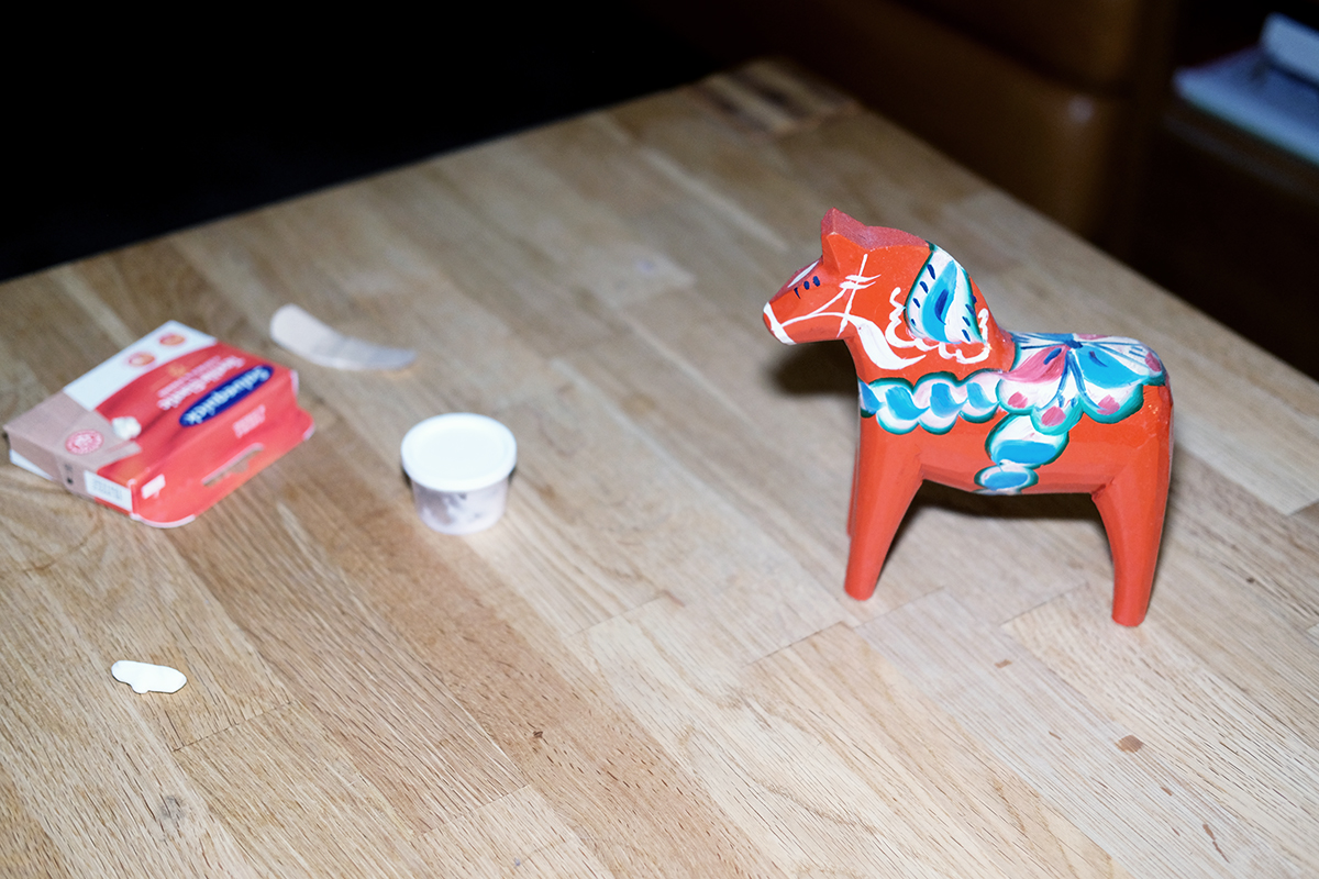 Den svåraste utmaningen för Mats är att bli vän med lägenheten. I sin tjänst har han en röd dalahäst som står vid ena hörnan av soffbordet. Den står alltid i samma position med mulen riktad mot dörren. Hästens uppgift är att skydda energierna i rummet. Han har fått den av sin far. Av alla saker han äger betyder den allra mest.