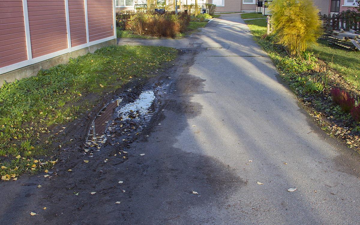 Grävskopan sätter den här novembermorgonen på ett sätt punkt för en orolig tid för Eva och Caroline. De har väntat länge på besked. Nu får de ha kvar sina blomsterplanteringar, trots att Rikshem hade kunnat välja att ta bort hela deras uteplatser. Men för Eva Byegård är oron ändå inte över. Hon har haft sin grönskande lilla trädgård i över 30 år och har planterat mängder av blommor. Utan staket är hon rädd att snöplogar och andra fordon kommer att köra sönder rabatterna. Uteplatsen ligger i ett hörn och på flera ställen i närheten finns leriga hjulspår i hörnen av gräsmattorna.