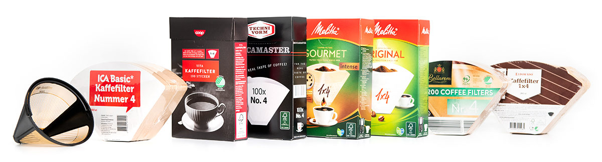 Två baristor fick blindtesta kaffe bryggt på sju olika pappersfilter och ett återanvändbart filter med guldplätering. Först lades filtren i kokande vatten för att se om de ger ifrån sig någon smak överhuvudtaget. Alla filter utom Coops gav en mer eller mindre tydlig bismak till vattnet och det är tydligt att bruna filter ger mer bismak än blekta.