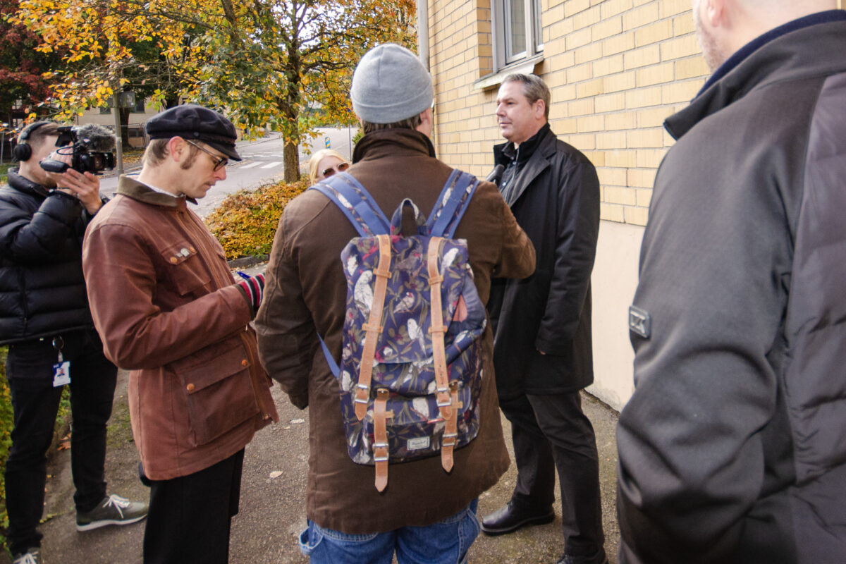 Journalisterna får vänta utanför porten medan låset till tvårummaren borras upp av en låssmed.