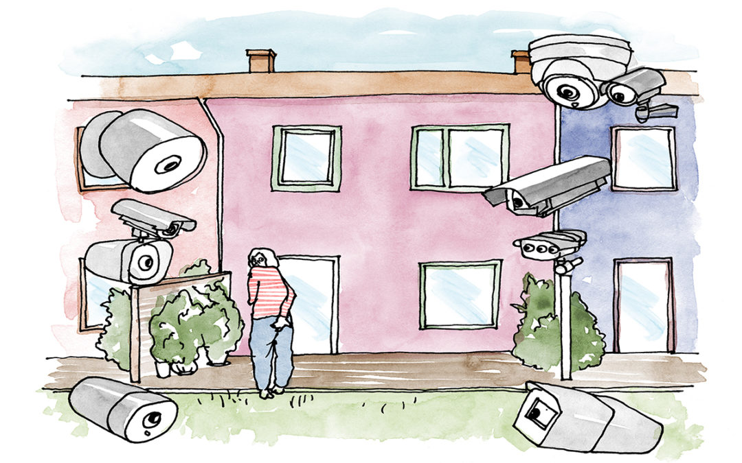 Jag hyr en radhuslägenhet i en länga med flera lägenheter. Alla har egen entré och uteplats. Runt husen är det en gemensam gräsmatta som går ända fram till vardagsrumsfönstren. Grannarna på båda sidor om mig har installerat hemlarm med ett par kameror, en högtalare och sensorer i alla dörrar och fönster.