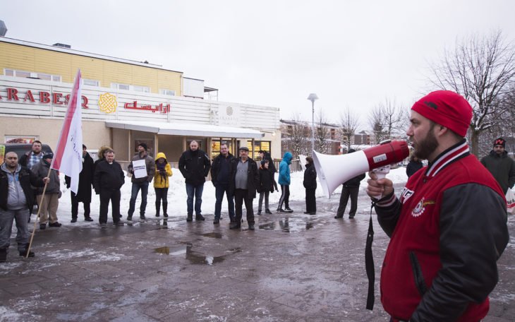 Kristofer Lundberg, ordförande för Hyresgästföreningen Angered, föreslås bli ny regionordförande. På bilden talar han vid en demonstration i Lövgärdet.