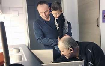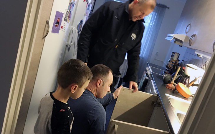 Sokol Gash, med sonen Melion, visar HFAB:s husvärd Ulf Jacobsson var det läcker under diskbänken.