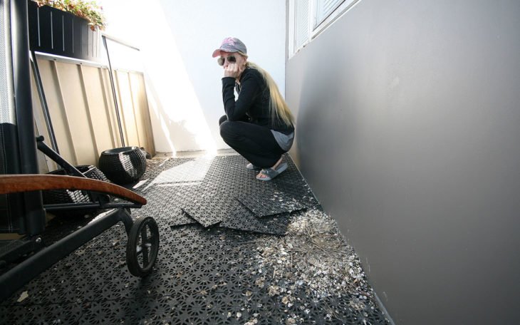 Sedan duvor byggt bo på hennes balkong vill Catherine inte vistas där. Duvorna har byggt två bo och övergivna fågelbon, som det nämast i bild, kan vara en källa till spridning av fågellöss in i bostaden. Lössen söker sig vidare när boet överges.