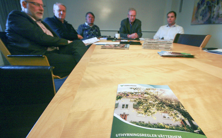 Nytänkande. Vätterhems ledning presenterar nya uthyrningsregler där en viktig del är att skapa mångfald i bostadsområdena. Stefan Attefall (KD), Ulf Alexandersson (M), Pelle Nordin (S), vd Thorbjörn Hammerth och marknadschef Raymond Paska.
