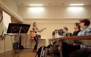 På Oskarshamnsföreningens årsmöte stod Ingela Carlsson för underhållningen. Hon spelade gitarr, dragspel, munspel och rytmägg. Till det sjöng hon och målade en tavla med temat "rum med utsikt"., Förhoppningsvis har alla våren som utsikt nu, därför blev blåsippor det första som kom på plats på tavlan. Ingela Carlsson följer upp med att sjunga ”Det är våren”., I Ingela Carlssons verktygslåda finns förutom instrument också färglåda och kritor., Det är full fart på scenen hela tiden., Solen gör entré på tavlan: ”Jag hoppas att det här är utsikten för er hela våren, sommaren och året.” Och om det inte är det så har Ingela Carlsson ett knep mot grå vardag.