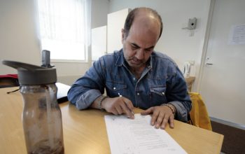 Test. Muhammad Ahmad Alsheik har följt med sin fru Nahed Bar till boskolan och gör sluttest. ”Faktiskt saknar vi mycket kunskap om skyldigheter och rättigheter, så det behövs att gå den här kursen.”, Det finns mycket att lära sig om boendet.