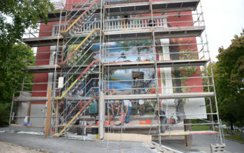 Farsta Artisterna är franska men tomtebolyckan är total halvvägs in i förfärdigandet av muralmålningen på Brunskogsbacken i Farsta Strand. 7 september 2016 kl 12:17