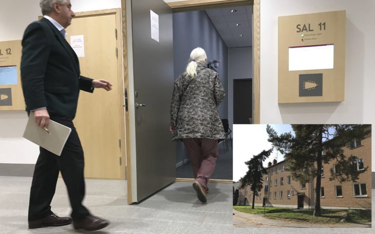 Ballo Zachrisson på väg in till hyresnämnden med sin advokat Mats Ljungqvist. Hon vill inte ge några kommentarer gällande prövningen av en ny tvångsförvaltning av fastigheten på Hallebergsvägen 29-33 i Traneberg.