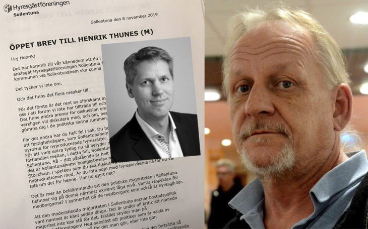 Thomas Axelsson, ordförande i Hyresgästföreningen Sollentuna (till höger i bild) har skrivit ett öppet brev till Henrik Thunes (M).