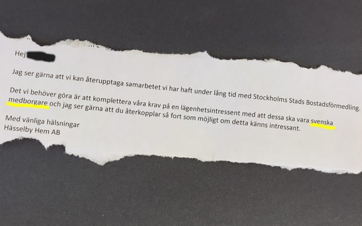 Mejlsvaret från Hässelby Hem visar bolagets önskan om krav på svenskt medborgarskap för att få en lägenhet.