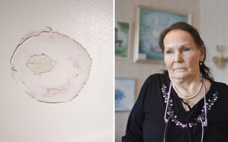 Marjatta Pulkka blev blöt på ryggen när hon gick på toaletten. I toalettaket syns ett sort märke efter den vattenfyllda blåsan.