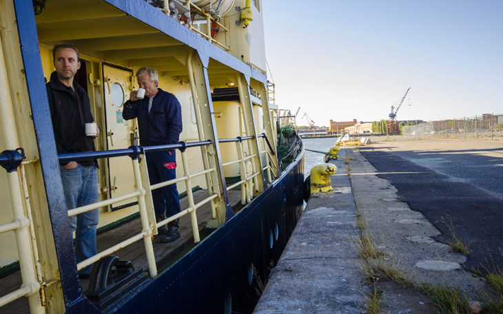Om några år är det fullt av lägenheter på piren i Frihamnen där Emil Heijel och Börje Karlsson lagt till med utbildningsfartyget m/s Origo. "Det blir som ett lotteri. Man är schysst mot några men inte alla. Bättre då att bygga för hela marknaden", tycker Emil när han får frågan om vem som ska få bo i de billigaste hyresrätterna.
