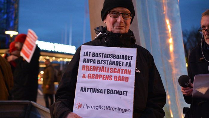 Ola Terlegård från lokala hyresgästföreningen på Gropens Gård och Bredfjällsgatan talade på manifestationen utanför kommunfullmäktiges sammanträde."Vårt område har dränerats på pengar år efter år. De olika privata förvaltarna har aldrig gjort några ärliga försök att komma ifatt med underhållet" sade han och uppmanade politikerna att låta allmännyttan ta över.