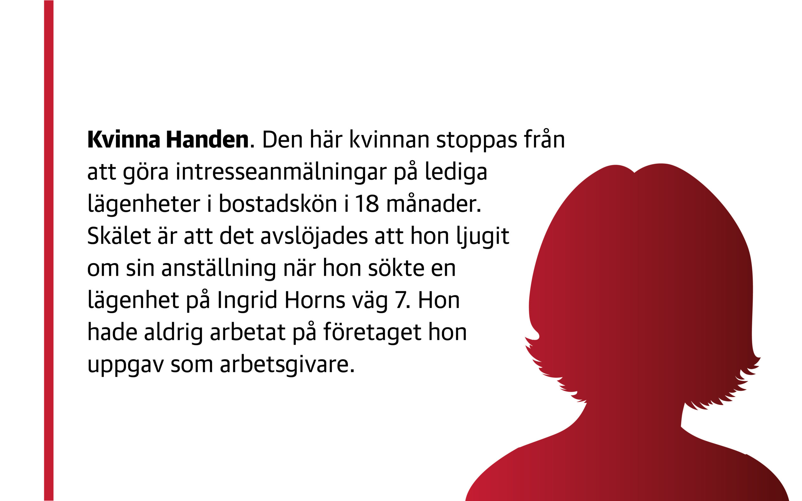 Men när Bostadsförmedlingen i Stockholms utredare börjar kolla upp det hela visar det sig inte stämma. Den bostadssökande arbetar inte på företaget och tjänar inte 560 000 kronor per år.