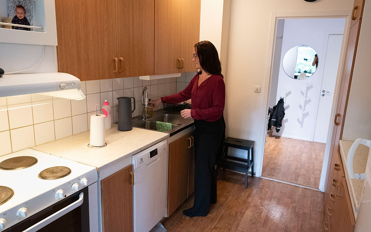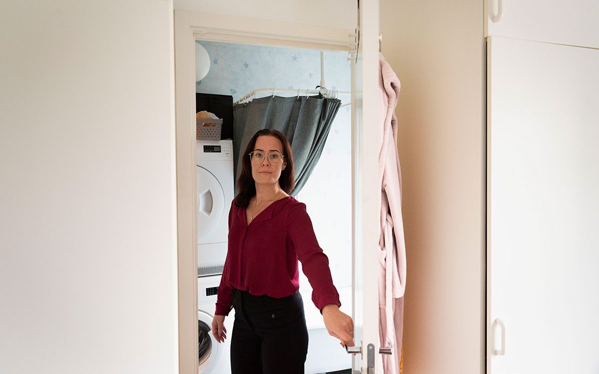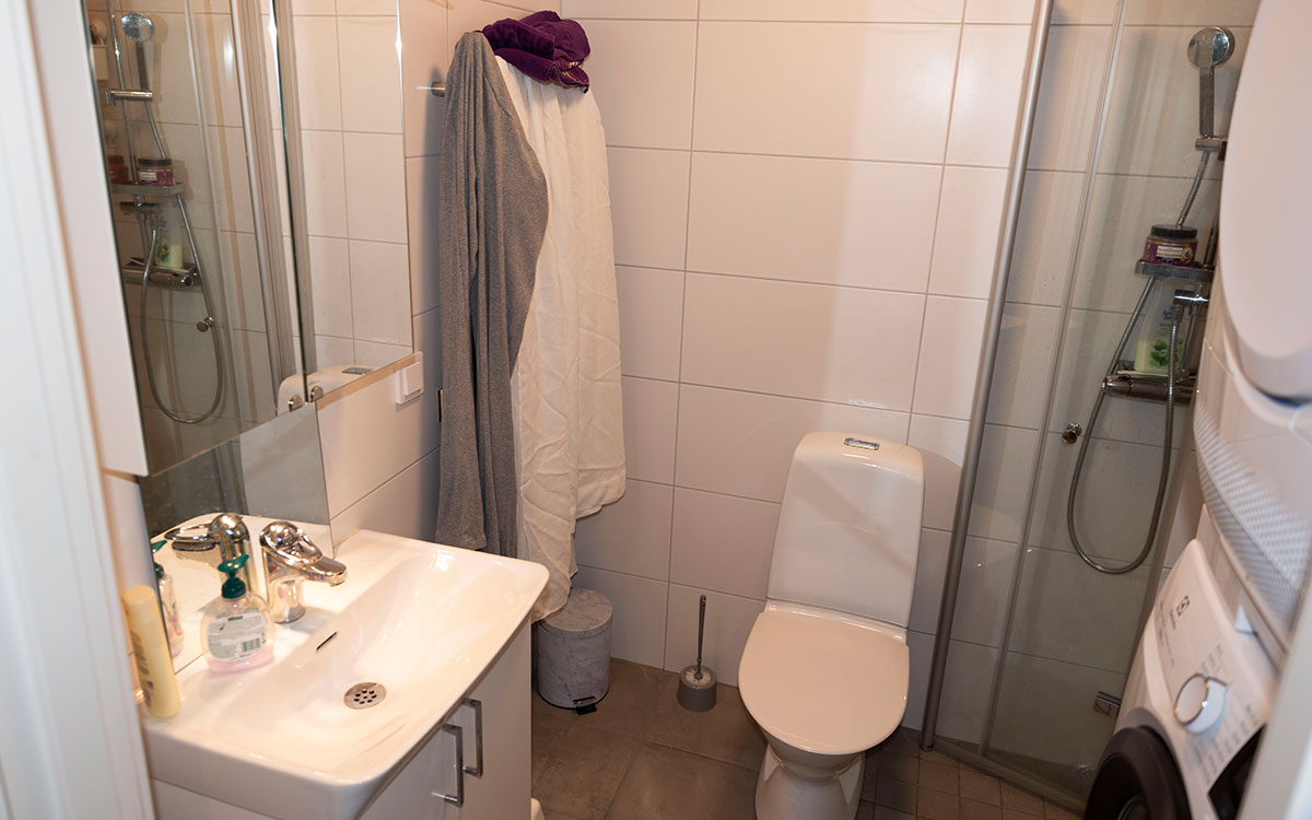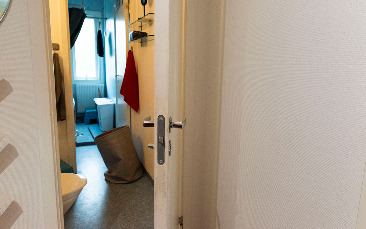 När hon och de tre barnen flyttade in i trerumslägenheten var planlösningen en viktig orsak till att hon tackade ja. Det finns bara ett badrum som de fem personerna i lägenheten ska dela på. Men eftersom de finns två dörrar in till badrummet och dessutom ytterligare en dörr som skiljer av delen med toaletten från delen med badkaret och duschen kan flera personer använda det samtidigt.