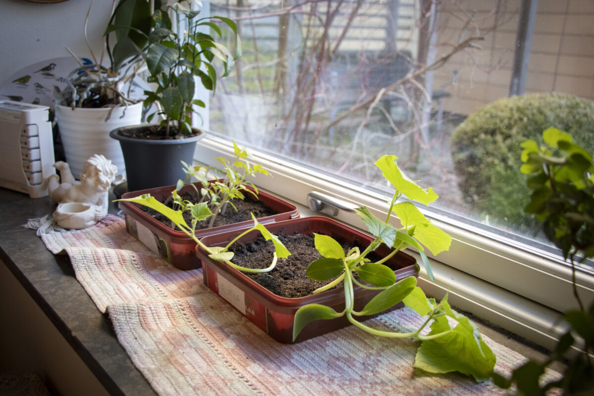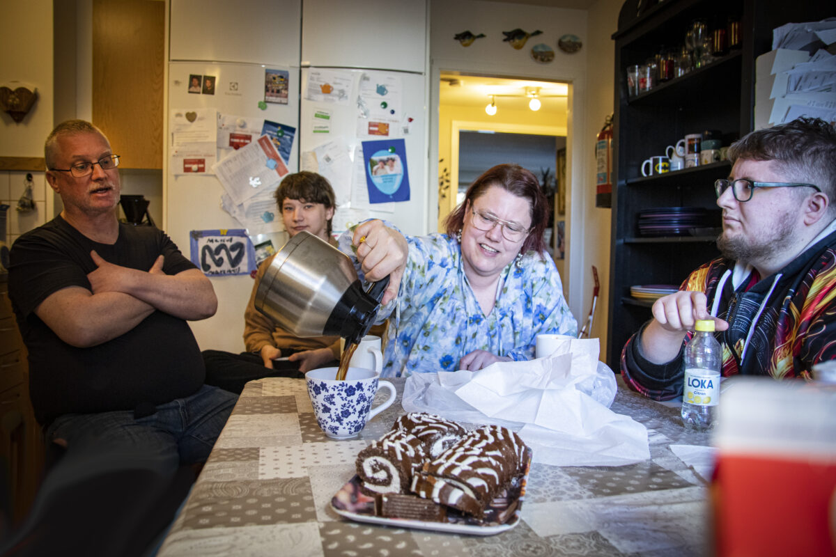 Hon häller upp kaffe och ställer fram rulltårta i deras nya kök. På fönsterbrädan står odlingar för tomat och gurka.