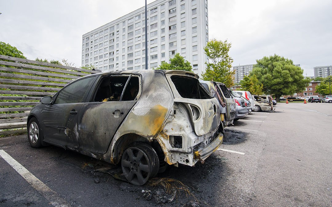 På parkeringen vid Frölunda torg har 15 bilar på rad blivit helt eller delvis förstörda. Thomas Petersen är en av många som stannat till för att betrakta förödelsen.