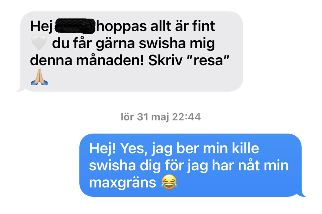 Andrahandshyresgästen har lämnat in skärmdumpar av sms till hyresnämnden. De visar hur kvinnan omväxlande vill ha betalt med swish, banköverföringar eller kontanter.