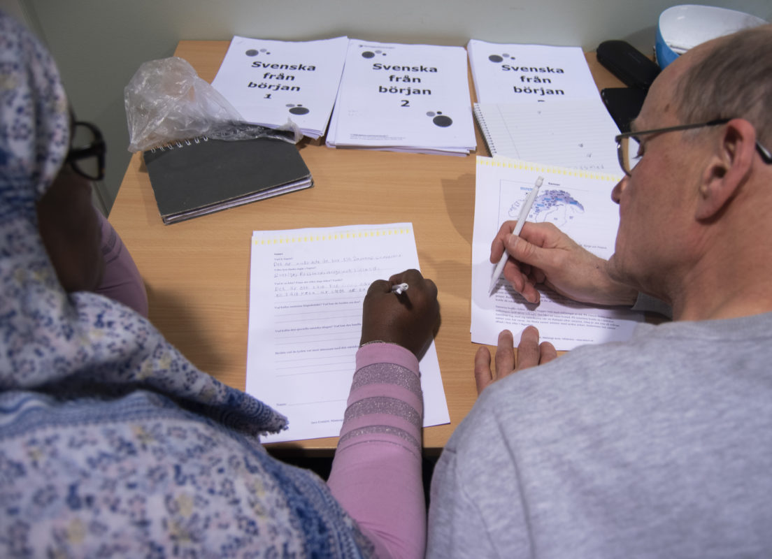 – Vi har ett visst material från vuxenutbildningen som vi följer. Vi läser texter tillsammans och hjälper dem när de inte förstår, berättar Per-Erik Karlsson.