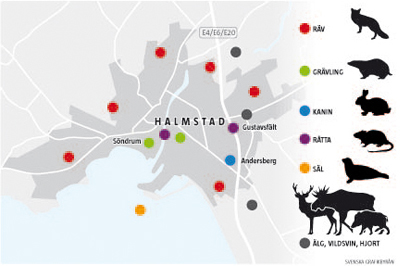 – Rävar finns mitt inne i stan, i villaområdena, berättar Fredrik Lindespång, naturparksmästare i Halmstad. Älg, hjort och vildsvin är också vanligt, inte i centrum men på andra sidan E6:an. Motorvägen sätter ju stopp för dem där.