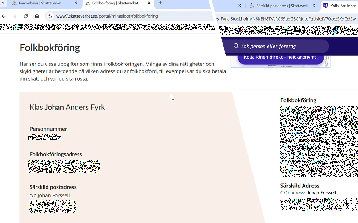 Vi går in på Skatteverkets hemsida, legitimerar oss med våra bank-id:n och klickar vidare för att anmäla en särskild postadress.