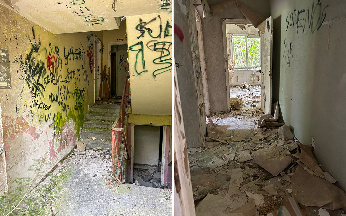 En bit bort, inne i skogen, står två övervuxna och totalt nedgångna före detta hyreshus. De har varit obebodda i tiotals år. Men senare ska även de rivas, på kommunens bekostnad.