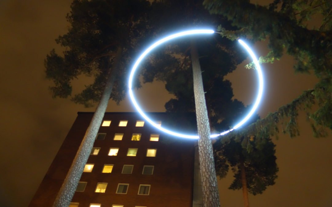 Tidsinställda projektioner på rymdtemat lyser upp husgavlar och i tidigare skumma skogspartier skiner stora cirklar, sex-sju meter i diameter, runt tallar.