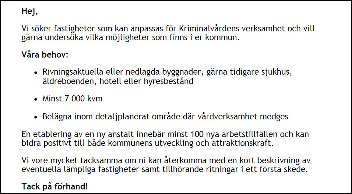 Straffskärpningar och en ny kriminalpolitik har lett till att fler häkten och fängelser måste byggas. På sin hemsida efterlyser Kriminalvården lämpliga lokaler hos fastighetsägare över hela landet – och det är brådskande. Myndigheten planerar att tredubbla anstalt- och häktesplatserna till 2034.