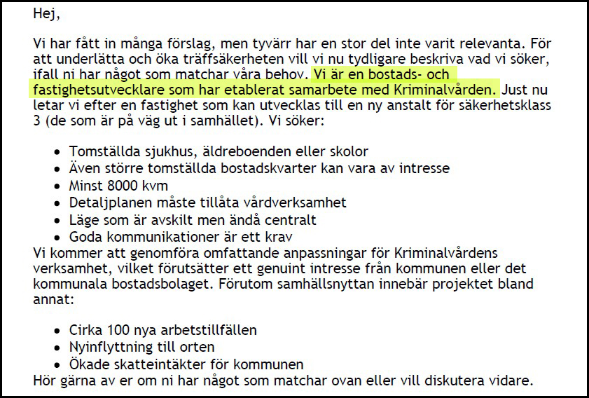 I ett av utskicken skrev Rossoneri Group att de har ”etablerat samarbete med Kriminalvården”.