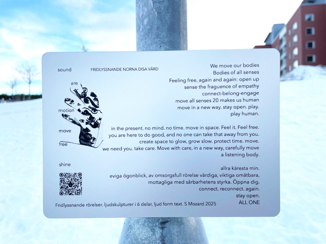 Sex högtalare med påsar i olika färger och mönster är uppsatta på lika många lyktstolpar längs promenadslingan nedanför de höga tegelhusen i Nacksta, i Sundsvall.