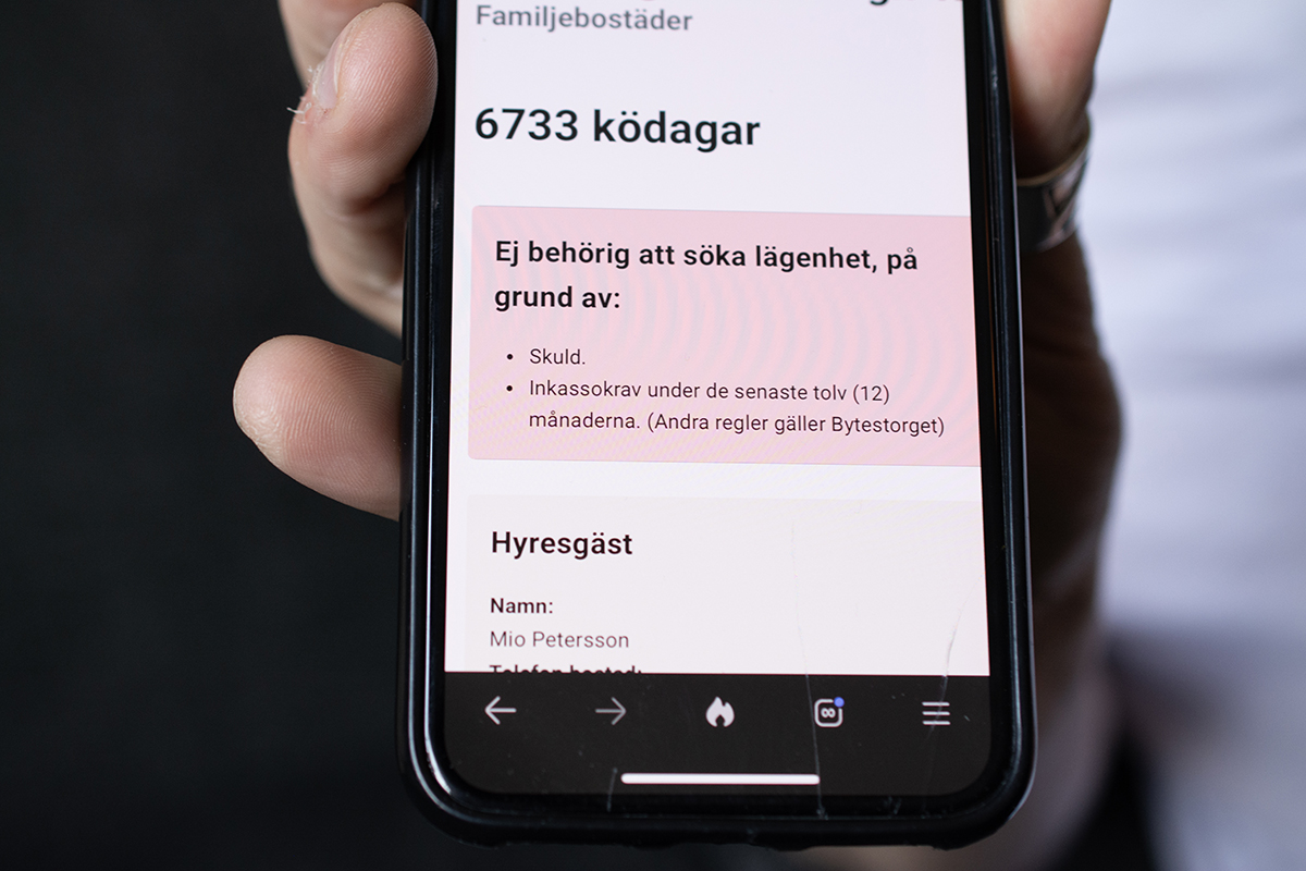 – Jag letar efter en större lägenhet. Då och då får jag ett mejl om att det kommit ett erbjudande som matchar mina önskemål. När jag går in på sidan kan jag se objektet, men jag är spärrad från att söka. Det står att jag har en skuld, säger Mio Petersson.
