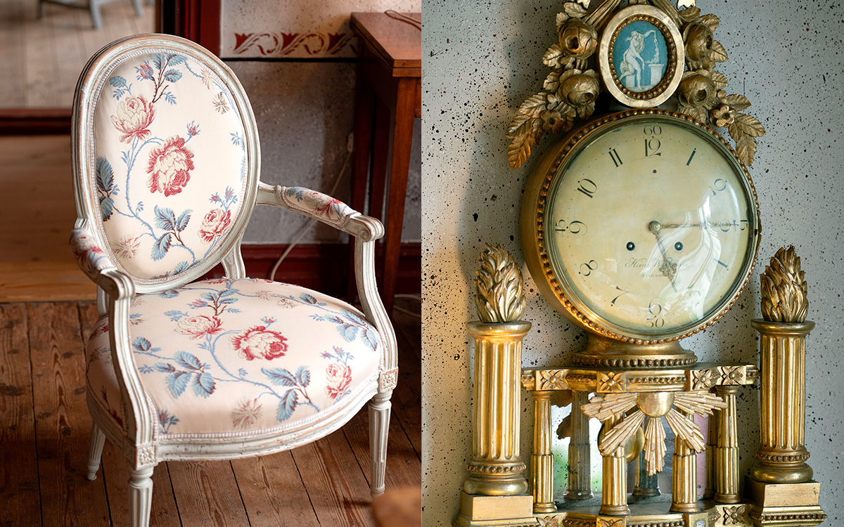 – Jag kan peka ut många fler favoriter än så. Men om jag ska välja tre saker får det bli ett alrotsbord, en klocka från 1780-talet som tickar och går så troligt, samt en fransk fåtölj som är snickrad i valnöt.