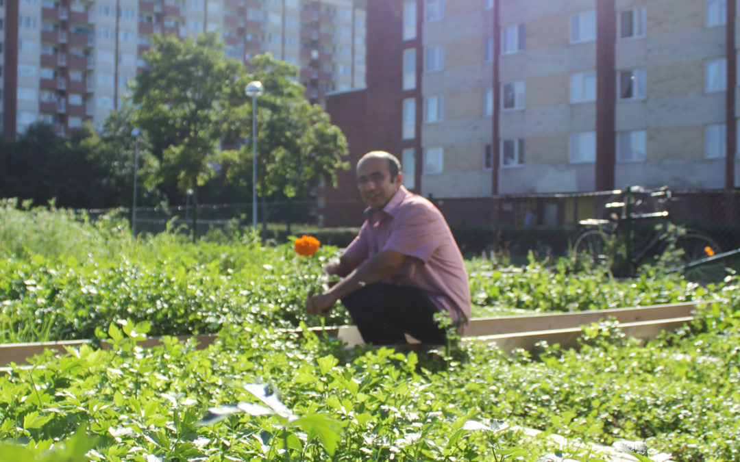 Solrosorna sträcker upp sig mot himlen och det lyser grönt av frodig mangold och kryddväxter. Vi befinner oss i miljonprogramsområdet Årby i Eskilstuna, där hyresvärden Graflunds anlagt ett 40-tal odlingslotter som hyresgästerna får hyra. En av dem som lyckats få en av de populära lotterna är Sabah Abdollahpour. Här odlar han gurka, tomat, mynta, dill, basilika och koriander. Kryddorna torkar han och hans fru och gurkorna lägger de in.