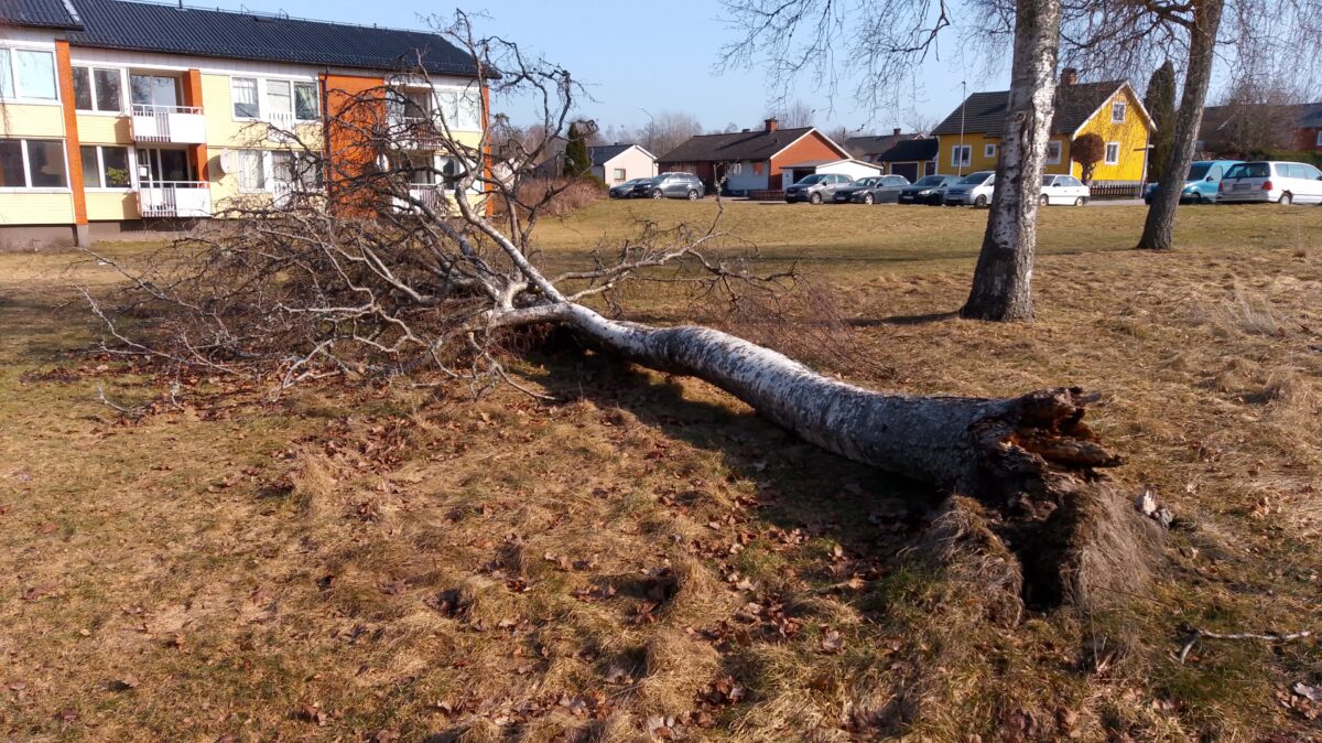 Det ligger ett stort träd på fotbollsplanen i kvarteret, som inte är borttaget sedan cirka ett år…