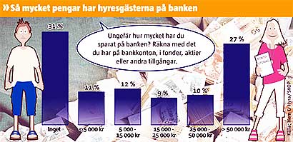 Fyra av tio hyresgäster har mindre än 5 000 kronor sparade, visar Hem & Hyras Skop-undersökning bland 1 000 hyresgäster. Då omfattas såväl bankkonton som aktier och fonder.