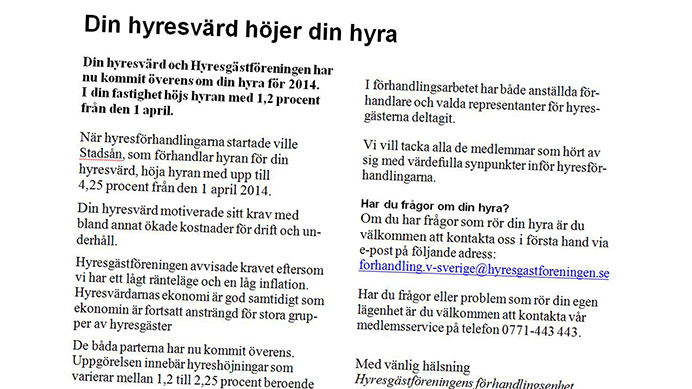 Efter förhandlingar med Hyresgästföreningen höjs hyrorna istället med 1,2 till 2,25 procent, beroende på boendets kvalité och lägenhetens nuvarande hyresnivå. Detta enligt ett brev som Hyresgästföreningen har skickat ut till berörda medlemmar.